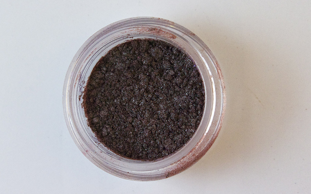 A brick red blends with a brownish tone and is accented by greens and blues. Color shifting eyeshadow.